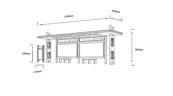 產(chǎn)品外觀 / PRODUCT DETAILS 產(chǎn)品信息 / PRODUCT INFO 【產(chǎn)品名稱】:城市品位候車亭PW6 【產(chǎn)品系列】:城市品位候車亭 【產(chǎn)品型號】:PW6 【產(chǎn)品規(guī)格】:長10800mm 寬1700mm 高2900mm 【產(chǎn)品材質(zhì)】:熱鍍鋅鋼板 【使用年限】:10-15年 【詳情致電】:181-5189-0417、157-5170-8886 備注:產(chǎn)品可根據(jù)用戶需求選用材質(zhì)、顏色及配件,個性化定制。 1、表面采用靜電噴塑(氟碳烤漆/搪瓷處理) 2、頂棚采用100*100*1.5mm、100*150*2mm鍍鋅管,3mm鍍鋅板激光切割件、1.5mm鍍鋅板焊接骨架,鋪1mm鍍鋅板(10mm陽光板) 3、立柱采用150*150*3mm鍍鋅管 4、箱體采用1.5mm鍍鋅板折彎焊接成型,門框采用全玻鋁合金型材,視窗采用6mm鋼化玻璃 5、照明電器采用LED燈粒 產(chǎn)品尺寸 / PRODUCT SIZE 關(guān)于輝盛 / 為社會分擔(dān)責(zé)任,為客戶創(chuàng)造價值 宿遷輝盛廣告設(shè)備有限公司是一家集設(shè)計、研發(fā)、生產(chǎn)為一體的城市公共設(shè)施生產(chǎn)型企業(yè)。主要產(chǎn)品有:候車公交亭、公交站臺、閱報欄、路名牌、垃圾箱、燈箱等市政設(shè)施系列產(chǎn)品和工程配套設(shè)施系列產(chǎn)品,現(xiàn)有高級技師30多人,高級職稱設(shè)計人員10人,是一家具有自主開發(fā)和設(shè)計能力的以公交亭、智能公交為主導(dǎo)的綜合性城市公共設(shè)施制造企業(yè)。為了進一步改善生產(chǎn)工藝,提高產(chǎn)品質(zhì)量,公司引進了先進生產(chǎn)設(shè)備,包括立臥式加工中心,工業(yè)涂裝流水線,CNC車床,線切割機,大型數(shù)控板機,數(shù)控折邊機,數(shù)控沖孔機床,大型折彎機等。公司還專門成立了產(chǎn)品研發(fā)部門,現(xiàn)每年自主開發(fā)或應(yīng)客戶要求設(shè)計推出多款新產(chǎn)品。 榮譽資質(zhì) / ENTERPRISE HONOR