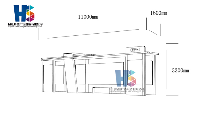 產(chǎn)品外觀 / PRODUCT DETAILS 產(chǎn)品信息 / PRODUCT INFO 【產(chǎn)品名稱】:新款候車亭HS56 【產(chǎn)品系列】:新款候車亭 【產(chǎn)品型號(hào)】:HS56 【產(chǎn)品規(guī)格】:長(zhǎng)11000mm 寬1600mm 高3300mm 【產(chǎn)品材質(zhì)】:熱鍍鋅鋼板 【使用年限】:10-15年 【詳情致電】:181-5189-0417、157-5170-8886 備注:產(chǎn)品可根據(jù)用戶需求選用材質(zhì)、顏色及配件,個(gè)性化定制。 1、表面采用靜電噴塑(氟碳烤漆/搪瓷處理) 2、頂棚采用100*100*1.5mm、100*150*2mm鍍鋅管,3mm鍍鋅板激光切割件、1.5mm鍍鋅板焊接骨架,鋪1mm鍍鋅板(10mm陽(yáng)光板) 3、立柱采用150*150*3mm鍍鋅管 4、箱體采用1.5mm鍍鋅板折彎焊接成型,門(mén)框采用全玻鋁合金型材,視窗采用6mm鋼化玻璃 5、照明電器采用LED燈粒 產(chǎn)品尺寸 / PRODUCT SIZE 關(guān)于輝盛 / 為社會(huì)分擔(dān)責(zé)任,為客戶創(chuàng)造價(jià)值 宿遷輝盛廣告設(shè)備有限公司是一家集設(shè)計(jì)、研發(fā)、生產(chǎn)為一體的城市公共設(shè)施生產(chǎn)型企業(yè)。主要產(chǎn)品有:候車公交亭、公交站臺(tái)、閱報(bào)欄、路名牌、垃圾箱、燈箱等市政設(shè)施系列產(chǎn)品和工程配套設(shè)施系列產(chǎn)品,現(xiàn)有高級(jí)技師30多人,高級(jí)職稱設(shè)計(jì)人員10人,是一家具有自主開(kāi)發(fā)和設(shè)計(jì)能力的以公交亭、智能公交為主導(dǎo)的綜合性城市公共設(shè)施制造企業(yè)。為了進(jìn)一步改善生產(chǎn)工藝,提高產(chǎn)品質(zhì)量,公司引進(jìn)了先進(jìn)生產(chǎn)設(shè)備,包括立臥式加工中心,工業(yè)涂裝流水線,CNC車床,線切割機(jī),大型數(shù)控板機(jī),數(shù)控折邊機(jī),數(shù)控沖孔機(jī)床,大型折彎?rùn)C(jī)等。公司還專門(mén)成立了產(chǎn)品研發(fā)部門(mén),現(xiàn)每年自主開(kāi)發(fā)或應(yīng)客戶要求設(shè)計(jì)推出多款新產(chǎn)品。 榮譽(yù)資質(zhì) / ENTERPRISE HONOR