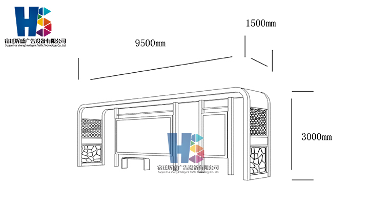 產(chǎn)品外觀 / PRODUCT DETAILS 產(chǎn)品信息 / PRODUCT INFO 【產(chǎn)品名稱】:新款候車亭HS26 【產(chǎn)品系列】:新款候車亭 【產(chǎn)品型號】:HS26 【產(chǎn)品規(guī)格】:長9500mm 寬1500mm 高3000mm 【產(chǎn)品材質(zhì)】:熱鍍鋅鋼板 【使用年限】:10-15年 【詳情致電】:181-5189-0417、157-5170-8886 備注:產(chǎn)品可根據(jù)用戶需求選用材質(zhì)、顏色及配件,個性化定制。 1、表面采用靜電噴塑(氟碳烤漆/搪瓷處理) 2、頂棚采用100*100*1.5mm、100*150*2mm鍍鋅管,3mm鍍鋅板激光切割件、1.5mm鍍鋅板焊接骨架,鋪1mm鍍鋅板(10mm陽光板) 3、立柱采用150*150*3mm鍍鋅管 4、箱體采用1.5mm鍍鋅板折彎焊接成型,門框采用全玻鋁合金型材,視窗采用6mm鋼化玻璃 5、照明電器采用LED燈粒 產(chǎn)品尺寸 / PRODUCT SIZE 關(guān)于輝盛 / 為社會分擔(dān)責(zé)任,為客戶創(chuàng)造價值 宿遷輝盛廣告設(shè)備有限公司是一家集設(shè)計、研發(fā)、生產(chǎn)為一體的城市公共設(shè)施生產(chǎn)型企業(yè)。主要產(chǎn)品有:候車公交亭、公交站臺、閱報欄、路名牌、垃圾箱、燈箱等市政設(shè)施系列產(chǎn)品和工程配套設(shè)施系列產(chǎn)品,現(xiàn)有高級技師30多人,高級職稱設(shè)計人員10人,是一家具有自主開發(fā)和設(shè)計能力的以公交亭、智能公交為主導(dǎo)的綜合性城市公共設(shè)施制造企業(yè)。為了進一步改善生產(chǎn)工藝,提高產(chǎn)品質(zhì)量,公司引進了先進生產(chǎn)設(shè)備,包括立臥式加工中心,工業(yè)涂裝流水線,CNC車床,線切割機,大型數(shù)控板機,數(shù)控折邊機,數(shù)控沖孔機床,大型折彎機等。公司還專門成立了產(chǎn)品研發(fā)部門,現(xiàn)每年自主開發(fā)或應(yīng)客戶要求設(shè)計推出多款新產(chǎn)品。 榮譽資質(zhì) / ENTERPRISE HONOR