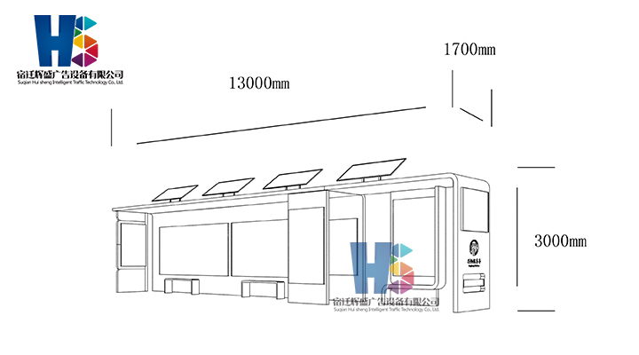產(chǎn)品外觀 / PRODUCT DETAILS 產(chǎn)品信息 / PRODUCT INFO 【產(chǎn)品名稱】:新款候車亭HS23 【產(chǎn)品系列】:新款候車亭 【產(chǎn)品型號(hào)】:HS23 【產(chǎn)品規(guī)格】:長(zhǎng)13000mm 寬1700mm 高3000mm 【產(chǎn)品材質(zhì)】:熱鍍鋅鋼板 【使用年限】:10-15年 【詳情致電】:181-5189-0417、157-5170-8886 備注:產(chǎn)品可根據(jù)用戶需求選用材質(zhì)、顏色及配件,個(gè)性化定制。 1、表面采用靜電噴塑(氟碳烤漆/搪瓷處理) 2、頂棚采用100*100*1.5mm、100*150*2mm鍍鋅管,3mm鍍鋅板激光切割件、1.5mm鍍鋅板焊接骨架,鋪1mm鍍鋅板(10mm陽光板) 3、立柱采用150*150*3mm鍍鋅管 4、箱體采用1.5mm鍍鋅板折彎焊接成型,門框采用全玻鋁合金型材,視窗采用6mm鋼化玻璃 5、照明電器采用LED燈粒 產(chǎn)品尺寸 / PRODUCT SIZE 關(guān)于輝盛 / 為社會(huì)分擔(dān)責(zé)任,為客戶創(chuàng)造價(jià)值 宿遷輝盛廣告設(shè)備有限公司是一家集設(shè)計(jì)、研發(fā)、生產(chǎn)為一體的城市公共設(shè)施生產(chǎn)型企業(yè)。主要產(chǎn)品有:候車公交亭、公交站臺(tái)、閱報(bào)欄、路名牌、垃圾箱、燈箱等市政設(shè)施系列產(chǎn)品和工程配套設(shè)施系列產(chǎn)品,現(xiàn)有高級(jí)技師30多人,高級(jí)職稱設(shè)計(jì)人員10人,是一家具有自主開發(fā)和設(shè)計(jì)能力的以公交亭、智能公交為主導(dǎo)的綜合性城市公共設(shè)施制造企業(yè)。為了進(jìn)一步改善生產(chǎn)工藝,提高產(chǎn)品質(zhì)量,公司引進(jìn)了先進(jìn)生產(chǎn)設(shè)備,包括立臥式加工中心,工業(yè)涂裝流水線,CNC車床,線切割機(jī),大型數(shù)控板機(jī),數(shù)控折邊機(jī),數(shù)控沖孔機(jī)床,大型折彎?rùn)C(jī)等。公司還專門成立了產(chǎn)品研發(fā)部門,現(xiàn)每年自主開發(fā)或應(yīng)客戶要求設(shè)計(jì)推出多款新產(chǎn)品。 榮譽(yù)資質(zhì) / ENTERPRISE HONOR