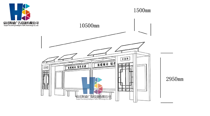 產(chǎn)品外觀 / PRODUCT DETAILS 產(chǎn)品信息 / PRODUCT INFO 【產(chǎn)品名稱(chēng)】:新款候車(chē)亭HS8 【產(chǎn)品系列】:新款候車(chē)亭 【產(chǎn)品型號(hào)】:HS8 【產(chǎn)品規(guī)格】:長(zhǎng)10500mm 寬1500mm 高2950mm 【產(chǎn)品材質(zhì)】:熱鍍鋅鋼板 【使用年限】:10-15年 【詳情致電】:181-5189-0417、157-5170-8886 備注:產(chǎn)品可根據(jù)用戶需求選用材質(zhì)、顏色及配件,個(gè)性化定制。 1、表面采用靜電噴塑(氟碳烤漆/搪瓷處理) 2、頂棚采用100*100*1.5mm、100*150*2mm鍍鋅管,3mm鍍鋅板激光切割件、1.5mm鍍鋅板焊接骨架,鋪1mm鍍鋅板(10mm陽(yáng)光板) 3、立柱采用150*150*3mm鍍鋅管 4、箱體采用1.5mm鍍鋅板折彎焊接成型,門(mén)框采用全玻鋁合金型材,視窗采用6mm鋼化玻璃 5、照明電器采用LED燈粒 產(chǎn)品尺寸 / PRODUCT SIZE 關(guān)于輝盛 / 為社會(huì)分擔(dān)責(zé)任,為客戶創(chuàng)造價(jià)值 宿遷輝盛廣告設(shè)備有限公司是一家集設(shè)計(jì)、研發(fā)、生產(chǎn)為一體的城市公共設(shè)施生產(chǎn)型企業(yè)。主要產(chǎn)品有:候車(chē)公交亭、公交站臺(tái)、閱報(bào)欄、路名牌、垃圾箱、燈箱等市政設(shè)施系列產(chǎn)品和工程配套設(shè)施系列產(chǎn)品,現(xiàn)有高級(jí)技師30多人,高級(jí)職稱(chēng)設(shè)計(jì)人員10人,是一家具有自主開(kāi)發(fā)和設(shè)計(jì)能力的以公交亭、智能公交為主導(dǎo)的綜合性城市公共設(shè)施制造企業(yè)。為了進(jìn)一步改善生產(chǎn)工藝,提高產(chǎn)品質(zhì)量,公司引進(jìn)了先進(jìn)生產(chǎn)設(shè)備,包括立臥式加工中心,工業(yè)涂裝流水線,CNC車(chē)床,線切割機(jī),大型數(shù)控板機(jī),數(shù)控折邊機(jī),數(shù)控沖孔機(jī)床,大型折彎?rùn)C(jī)等。公司還專(zhuān)門(mén)成立了產(chǎn)品研發(fā)部門(mén),現(xiàn)每年自主開(kāi)發(fā)或應(yīng)客戶要求設(shè)計(jì)推出多款新產(chǎn)品。 榮譽(yù)資質(zhì) / ENTERPRISE HONOR
