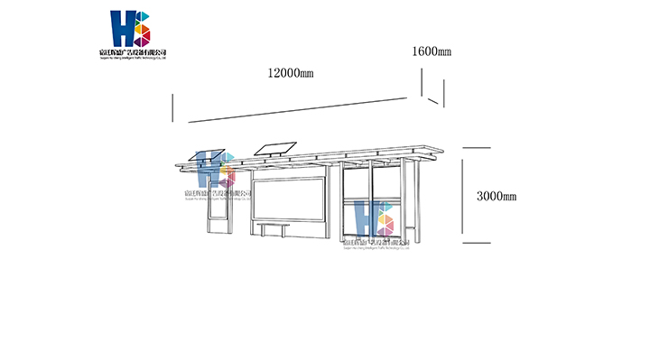產(chǎn)品外觀 / PRODUCT DETAILS 產(chǎn)品信息 / PRODUCT INFO 【產(chǎn)品名稱】:新款候車亭HS4 【產(chǎn)品系列】:新款候車亭 【產(chǎn)品型號(hào)】:HS4 【產(chǎn)品規(guī)格】:長(zhǎng)12000mm 寬1600mm 高3000mm 【產(chǎn)品材質(zhì)】:熱鍍鋅鋼板 【使用年限】:10-15年 【詳情致電】:181-5189-0417、157-5170-8886 備注:產(chǎn)品可根據(jù)用戶需求選用材質(zhì)、顏色及配件,個(gè)性化定制。 1、表面采用靜電噴塑(氟碳烤漆/搪瓷處理) 2、頂棚采用100*100*1.5mm、100*150*2mm鍍鋅管,3mm鍍鋅板激光切割件、1.5mm鍍鋅板焊接骨架,鋪1mm鍍鋅板(10mm陽(yáng)光板) 3、立柱采用150*150*3mm鍍鋅管 4、箱體采用1.5mm鍍鋅板折彎焊接成型,門框采用全玻鋁合金型材,視窗采用6mm鋼化玻璃 5、照明電器采用LED燈粒 產(chǎn)品尺寸 / PRODUCT SIZE 關(guān)于輝盛 / 為社會(huì)分擔(dān)責(zé)任,為客戶創(chuàng)造價(jià)值 宿遷輝盛廣告設(shè)備有限公司是一家集設(shè)計(jì)、研發(fā)、生產(chǎn)為一體的城市公共設(shè)施生產(chǎn)型企業(yè)。主要產(chǎn)品有:候車公交亭、公交站臺(tái)、閱報(bào)欄、路名牌、垃圾箱、燈箱等市政設(shè)施系列產(chǎn)品和工程配套設(shè)施系列產(chǎn)品,現(xiàn)有高級(jí)技師30多人,高級(jí)職稱設(shè)計(jì)人員10人,是一家具有自主開發(fā)和設(shè)計(jì)能力的以公交亭、智能公交為主導(dǎo)的綜合性城市公共設(shè)施制造企業(yè)。為了進(jìn)一步改善生產(chǎn)工藝,提高產(chǎn)品質(zhì)量,公司引進(jìn)了先進(jìn)生產(chǎn)設(shè)備,包括立臥式加工中心,工業(yè)涂裝流水線,CNC車床,線切割機(jī),大型數(shù)控板機(jī),數(shù)控折邊機(jī),數(shù)控沖孔機(jī)床,大型折彎?rùn)C(jī)等。公司還專門成立了產(chǎn)品研發(fā)部門,現(xiàn)每年自主開發(fā)或應(yīng)客戶要求設(shè)計(jì)推出多款新產(chǎn)品。 榮譽(yù)資質(zhì) / ENTERPRISE HONOR