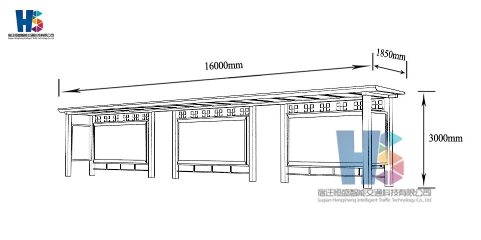 產(chǎn)品外觀 / PRODUCT DETAILS 產(chǎn)品信息 / PRODUCT INFO 【產(chǎn)品名稱】:中式古典候車亭GD15 【產(chǎn)品系列】:中式古典候車亭 【產(chǎn)品型號】:GD15 【產(chǎn)品規(guī)格】:長10800mm 寬1700mm 高2900mm 【產(chǎn)品材質(zhì)】:熱鍍鋅鋼板 【使用年限】:10-15年 【詳情致電】:181-5189-0417、157-5170-8886 備注:產(chǎn)品可根據(jù)用戶需求選用材質(zhì)、顏色及配件,個性化定制。 1、表面采用靜電噴塑(氟碳烤漆/搪瓷處理) 2、頂棚采用100*100*1.5mm、100*150*2mm鍍鋅管,3mm鍍鋅板激光切割件、1.5mm鍍鋅板焊接骨架,鋪1mm鍍鋅板(10mm陽光板) 3、立柱采用150*150*3mm鍍鋅管 4、箱體采用1.5mm鍍鋅板折彎焊接成型,門框采用全玻鋁合金型材,視窗采用6mm鋼化玻璃 5、照明電器采用LED燈粒 產(chǎn)品尺寸 / PRODUCT SIZE 關(guān)于輝盛 / 為社會分擔責任,為客戶創(chuàng)造價值 宿遷輝盛廣告設(shè)備有限公司是一家集設(shè)計、研發(fā)、生產(chǎn)為一體的城市公共設(shè)施生產(chǎn)型企業(yè)。主要產(chǎn)品有:候車公交亭、公交站臺、閱報欄、路名牌、垃圾箱、燈箱等市政設(shè)施系列產(chǎn)品和工程配套設(shè)施系列產(chǎn)品,現(xiàn)有高級技師30多人,高級職稱設(shè)計人員10人,是一家具有自主開發(fā)和設(shè)計能力的以公交亭、智能公交為主導(dǎo)的綜合性城市公共設(shè)施制造企業(yè)。為了進一步改善生產(chǎn)工藝,提高產(chǎn)品質(zhì)量,公司引進了先進生產(chǎn)設(shè)備,包括立臥式加工中心,工業(yè)涂裝流水線,CNC車床,線切割機,大型數(shù)控板機,數(shù)控折邊機,數(shù)控沖孔機床,大型折彎機等。公司還專門成立了產(chǎn)品研發(fā)部門,現(xiàn)每年自主開發(fā)或應(yīng)客戶要求設(shè)計推出多款新產(chǎn)品。 榮譽資質(zhì) / ENTERPRISE HONOR
