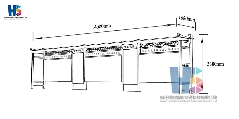 產(chǎn)品外觀 / PRODUCT DETAILS 產(chǎn)品信息 / PRODUCT INFO 【產(chǎn)品名稱】:中式古典候車亭GD14 【產(chǎn)品系列】:中式古典候車亭 【產(chǎn)品型號】:GD14 【產(chǎn)品規(guī)格】:長10800mm 寬1700mm 高2900mm 【產(chǎn)品材質(zhì)】:熱鍍鋅鋼板 【使用年限】:10-15年 【詳情致電】:181-5189-0417、157-5170-8886 備注:產(chǎn)品可根據(jù)用戶需求選用材質(zhì)、顏色及配件,個性化定制。 1、表面采用靜電噴塑(氟碳烤漆/搪瓷處理) 2、頂棚采用100*100*1.5mm、100*150*2mm鍍鋅管,3mm鍍鋅板激光切割件、1.5mm鍍鋅板焊接骨架,鋪1mm鍍鋅板(10mm陽光板) 3、立柱采用150*150*3mm鍍鋅管 4、箱體采用1.5mm鍍鋅板折彎焊接成型,門框采用全玻鋁合金型材,視窗采用6mm鋼化玻璃 5、照明電器采用LED燈粒 產(chǎn)品尺寸 / PRODUCT SIZE 關(guān)于輝盛 / 為社會分擔責任,為客戶創(chuàng)造價值 宿遷輝盛廣告設(shè)備有限公司是一家集設(shè)計、研發(fā)、生產(chǎn)為一體的城市公共設(shè)施生產(chǎn)型企業(yè)。主要產(chǎn)品有:候車公交亭、公交站臺、閱報欄、路名牌、垃圾箱、燈箱等市政設(shè)施系列產(chǎn)品和工程配套設(shè)施系列產(chǎn)品,現(xiàn)有高級技師30多人,高級職稱設(shè)計人員10人,是一家具有自主開發(fā)和設(shè)計能力的以公交亭、智能公交為主導(dǎo)的綜合性城市公共設(shè)施制造企業(yè)。為了進一步改善生產(chǎn)工藝,提高產(chǎn)品質(zhì)量,公司引進了先進生產(chǎn)設(shè)備,包括立臥式加工中心,工業(yè)涂裝流水線,CNC車床,線切割機,大型數(shù)控板機,數(shù)控折邊機,數(shù)控沖孔機床,大型折彎機等。公司還專門成立了產(chǎn)品研發(fā)部門,現(xiàn)每年自主開發(fā)或應(yīng)客戶要求設(shè)計推出多款新產(chǎn)品。 榮譽資質(zhì) / ENTERPRISE HONOR