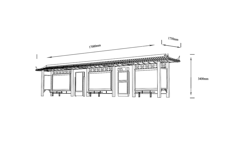 產品外觀 / PRODUCT DETAILS 產品信息 / PRODUCT INFO 【產品名稱】:中式古典候車亭GD5 【產品系列】:中式古典候車亭 【產品型號】:GD5 【產品規(guī)格】:長10800mm 寬1700mm 高2900mm 【產品材質】:熱鍍鋅鋼板 【使用年限】:10-15年 【詳情致電】:181-5189-0417、157-5170-8886 備注:產品可根據用戶需求選用材質、顏色及配件,個性化定制。 1、表面采用靜電噴塑(氟碳烤漆/搪瓷處理) 2、頂棚采用100*100*1.5mm、100*150*2mm鍍鋅管,3mm鍍鋅板激光切割件、1.5mm鍍鋅板焊接骨架,鋪1mm鍍鋅板(10mm陽光板) 3、立柱采用150*150*3mm鍍鋅管 4、箱體采用1.5mm鍍鋅板折彎焊接成型,門框采用全玻鋁合金型材,視窗采用6mm鋼化玻璃 5、照明電器采用LED燈粒 產品尺寸 / PRODUCT SIZE 關于輝盛 / 為社會分擔責任,為客戶創(chuàng)造價值 宿遷輝盛廣告設備有限公司是一家集設計、研發(fā)、生產為一體的城市公共設施生產型企業(yè)。主要產品有:候車公交亭、公交站臺、閱報欄、路名牌、垃圾箱、燈箱等市政設施系列產品和工程配套設施系列產品,現有高級技師30多人,高級職稱設計人員10人,是一家具有自主開發(fā)和設計能力的以公交亭、智能公交為主導的綜合性城市公共設施制造企業(yè)。為了進一步改善生產工藝,提高產品質量,公司引進了先進生產設備,包括立臥式加工中心,工業(yè)涂裝流水線,CNC車床,線切割機,大型數控板機,數控折邊機,數控沖孔機床,大型折彎機等。公司還專門成立了產品研發(fā)部門,現每年自主開發(fā)或應客戶要求設計推出多款新產品。 榮譽資質 / ENTERPRISE HONOR