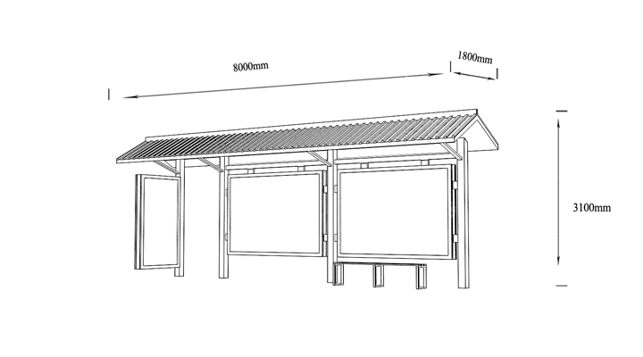 產(chǎn)品外觀 / PRODUCT DETAILS 產(chǎn)品信息 / PRODUCT INFO 【產(chǎn)品名稱】:中式古典候車亭GD2 【產(chǎn)品系列】:中式古典候車亭 【產(chǎn)品型號】:GD2 【產(chǎn)品規(guī)格】:長10800mm 寬1700mm 高2900mm 【產(chǎn)品材質(zhì)】:熱鍍鋅鋼板 【使用年限】:10-15年 【詳情致電】:181-5189-0417、157-5170-8886 備注:產(chǎn)品可根據(jù)用戶需求選用材質(zhì)、顏色及配件,個性化定制。 1、表面采用靜電噴塑(氟碳烤漆/搪瓷處理) 2、頂棚采用100*100*1.5mm、100*150*2mm鍍鋅管,3mm鍍鋅板激光切割件、1.5mm鍍鋅板焊接骨架,鋪1mm鍍鋅板(10mm陽光板) 3、立柱采用150*150*3mm鍍鋅管 4、箱體采用1.5mm鍍鋅板折彎焊接成型,門框采用全玻鋁合金型材,視窗采用6mm鋼化玻璃 5、照明電器采用LED燈粒 產(chǎn)品尺寸 / PRODUCT SIZE 關(guān)于輝盛 / 為社會分擔(dān)責(zé)任,為客戶創(chuàng)造價值 宿遷輝盛廣告設(shè)備有限公司是一家集設(shè)計、研發(fā)、生產(chǎn)為一體的城市公共設(shè)施生產(chǎn)型企業(yè)。主要產(chǎn)品有:候車公交亭、公交站臺、閱報欄、路名牌、垃圾箱、燈箱等市政設(shè)施系列產(chǎn)品和工程配套設(shè)施系列產(chǎn)品,現(xiàn)有高級技師30多人,高級職稱設(shè)計人員10人,是一家具有自主開發(fā)和設(shè)計能力的以公交亭、智能公交為主導(dǎo)的綜合性城市公共設(shè)施制造企業(yè)。為了進(jìn)一步改善生產(chǎn)工藝,提高產(chǎn)品質(zhì)量,公司引進(jìn)了先進(jìn)生產(chǎn)設(shè)備,包括立臥式加工中心,工業(yè)涂裝流水線,CNC車床,線切割機(jī),大型數(shù)控板機(jī),數(shù)控折邊機(jī),數(shù)控沖孔機(jī)床,大型折彎機(jī)等。公司還專門成立了產(chǎn)品研發(fā)部門,現(xiàn)每年自主開發(fā)或應(yīng)客戶要求設(shè)計推出多款新產(chǎn)品。 榮譽(yù)資質(zhì) / ENTERPRISE HONOR