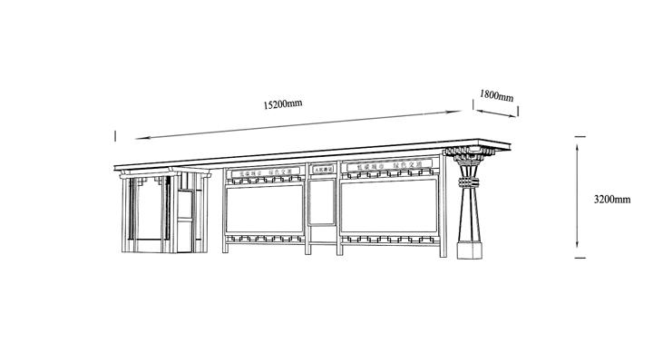 產(chǎn)品外觀 / PRODUCT DETAILS 產(chǎn)品信息 / PRODUCT INFO 【產(chǎn)品名稱】:中式古典候車亭GD1 【產(chǎn)品系列】:中式古典候車亭 【產(chǎn)品型號】:GD1 【產(chǎn)品規(guī)格】:長10800mm 寬1700mm 高2900mm 【產(chǎn)品材質(zhì)】:熱鍍鋅鋼板 【使用年限】:10-15年 【詳情致電】:181-5189-0417、157-5170-8886 備注:產(chǎn)品可根據(jù)用戶需求選用材質(zhì)、顏色及配件,個(gè)性化定制。 1、表面采用靜電噴塑(氟碳烤漆/搪瓷處理) 2、頂棚采用100*100*1.5mm、100*150*2mm鍍鋅管,3mm鍍鋅板激光切割件、1.5mm鍍鋅板焊接骨架,鋪1mm鍍鋅板(10mm陽光板) 3、立柱采用150*150*3mm鍍鋅管 4、箱體采用1.5mm鍍鋅板折彎焊接成型,門框采用全玻鋁合金型材,視窗采用6mm鋼化玻璃 5、照明電器采用LED燈粒 產(chǎn)品尺寸 / PRODUCT SIZE 關(guān)于輝盛 / 為社會分擔(dān)責(zé)任,為客戶創(chuàng)造價(jià)值 宿遷輝盛廣告設(shè)備有限公司是一家集設(shè)計(jì)、研發(fā)、生產(chǎn)為一體的城市公共設(shè)施生產(chǎn)型企業(yè)。主要產(chǎn)品有:候車公交亭、公交站臺、閱報(bào)欄、路名牌、垃圾箱、燈箱等市政設(shè)施系列產(chǎn)品和工程配套設(shè)施系列產(chǎn)品,現(xiàn)有高級技師30多人,高級職稱設(shè)計(jì)人員10人,是一家具有自主開發(fā)和設(shè)計(jì)能力的以公交亭、智能公交為主導(dǎo)的綜合性城市公共設(shè)施制造企業(yè)。為了進(jìn)一步改善生產(chǎn)工藝,提高產(chǎn)品質(zhì)量,公司引進(jìn)了先進(jìn)生產(chǎn)設(shè)備,包括立臥式加工中心,工業(yè)涂裝流水線,CNC車床,線切割機(jī),大型數(shù)控板機(jī),數(shù)控折邊機(jī),數(shù)控沖孔機(jī)床,大型折彎機(jī)等。公司還專門成立了產(chǎn)品研發(fā)部門,現(xiàn)每年自主開發(fā)或應(yīng)客戶要求設(shè)計(jì)推出多款新產(chǎn)品。 榮譽(yù)資質(zhì) / ENTERPRISE HONOR